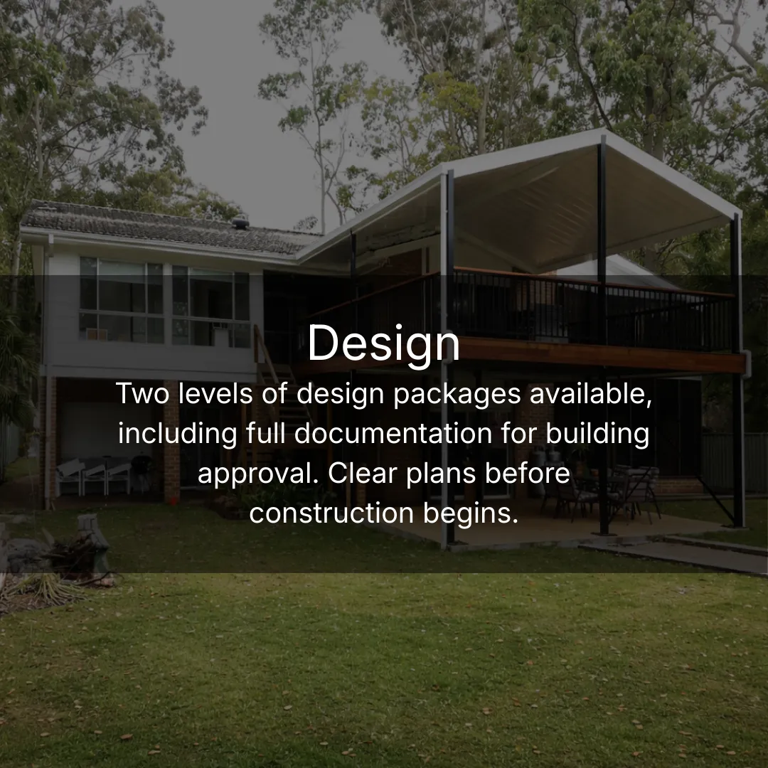 Two levels of design packages available, including full documentation for building approval. Clear plans before construction begins.